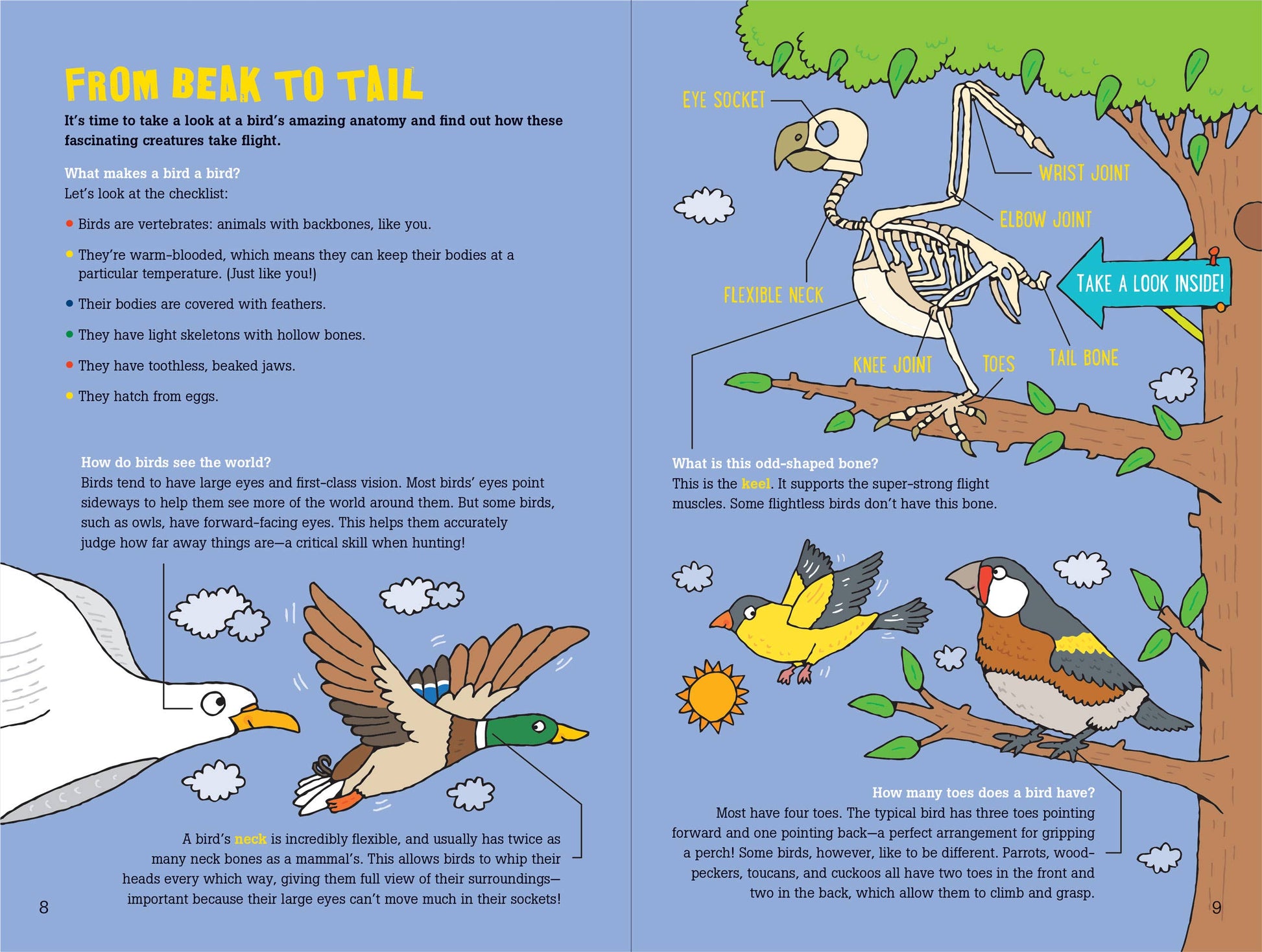 How do birds fly? What helps hawks home in on their prey? Are parrots the only birds that can mimic human speech? Kids will learn the answers to these questions and more as they discover the world of our feathered friends in this Q and A adventure. Along the way, they ll spot jokes and riddles that are sure to make them ''caw'' with laughter. Quirky, colorful, and educational reading! Question-and-answer format breaks down information into manageable chunks. Informal, kid-friendly language is breezy and fun. Ages 7 and up. Sturdy hardcover binding. Book measures 6'' wide x 9'' high. 48 pages.