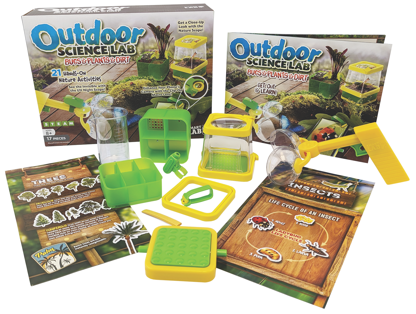 Outdoor Science Lab – Bugs, Dirt, & Plants is packed with more than 21 hands-on-activities and real science tools that invite kids to identify, classify, measure, test, and analyze the world around them. The kit features a clip-on macro lens compatible with your smartphones and tablets (not included). The lens allows for extreme close-ups of tiny creatures and objects.