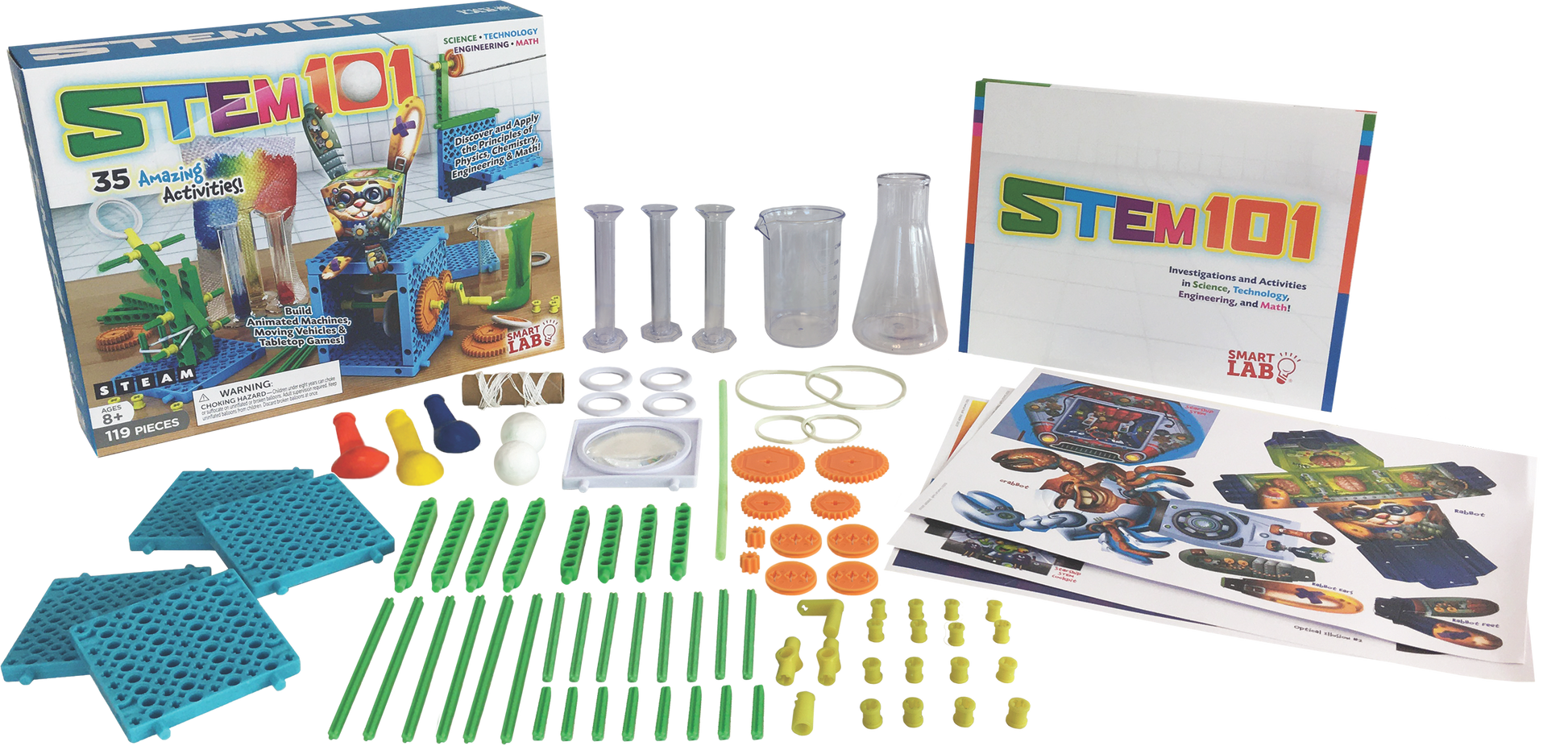 A good STEM toy relates to the real world, is hands-on, allows for problem-solving, is gender inclusive, builds confidence, and encourages creativity. STEM 101 checks all the boxes! This introduction to STEM learning includes an amazing array of real science equipment—mini graduated cylinders, an Erlenmeyer flask, a graduated beaker, a magnifying lens, and building materials such as boards, axles, posts, wheels, gears, and more — along with 30 activity cards to guide kids through an exciting, hands-on exploration of science, technology, engineering, and math.