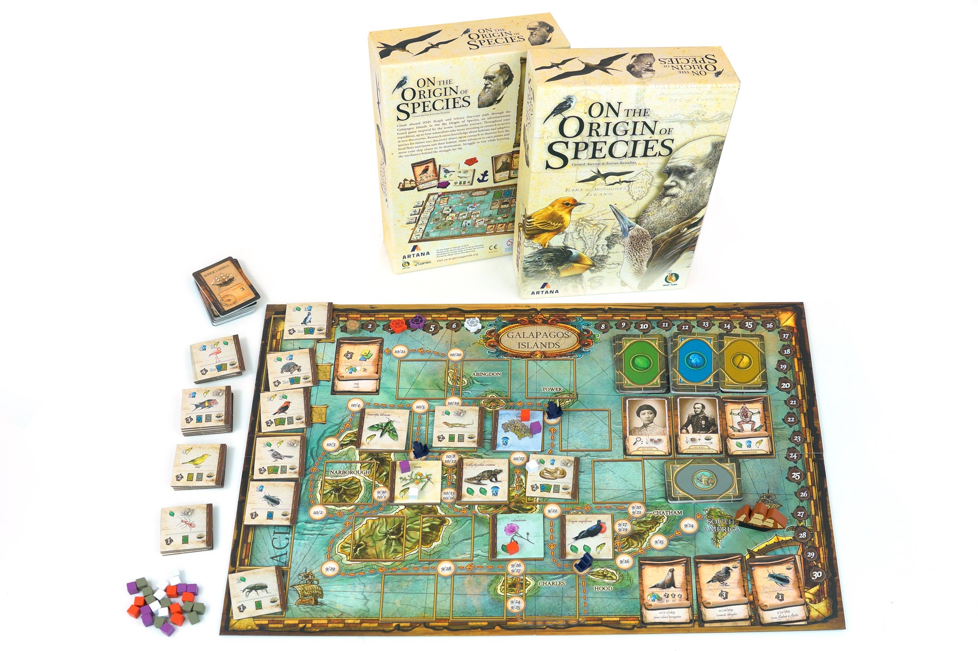 On the Origin of Species is a 2-4 player strategy board game in which each player will step into the adventure of young Charles Darwin on the HMS Beagle’s expedition through the Galapagos Islands, examining the local species and uncovering their natural history. Trace connections between the flora and fauna you discover as the Beagle journeys through the islands. Find help from the ship’s crew and uses for the tools in your luggage. Excel in your research and lead the way among your naturalist colleagues.