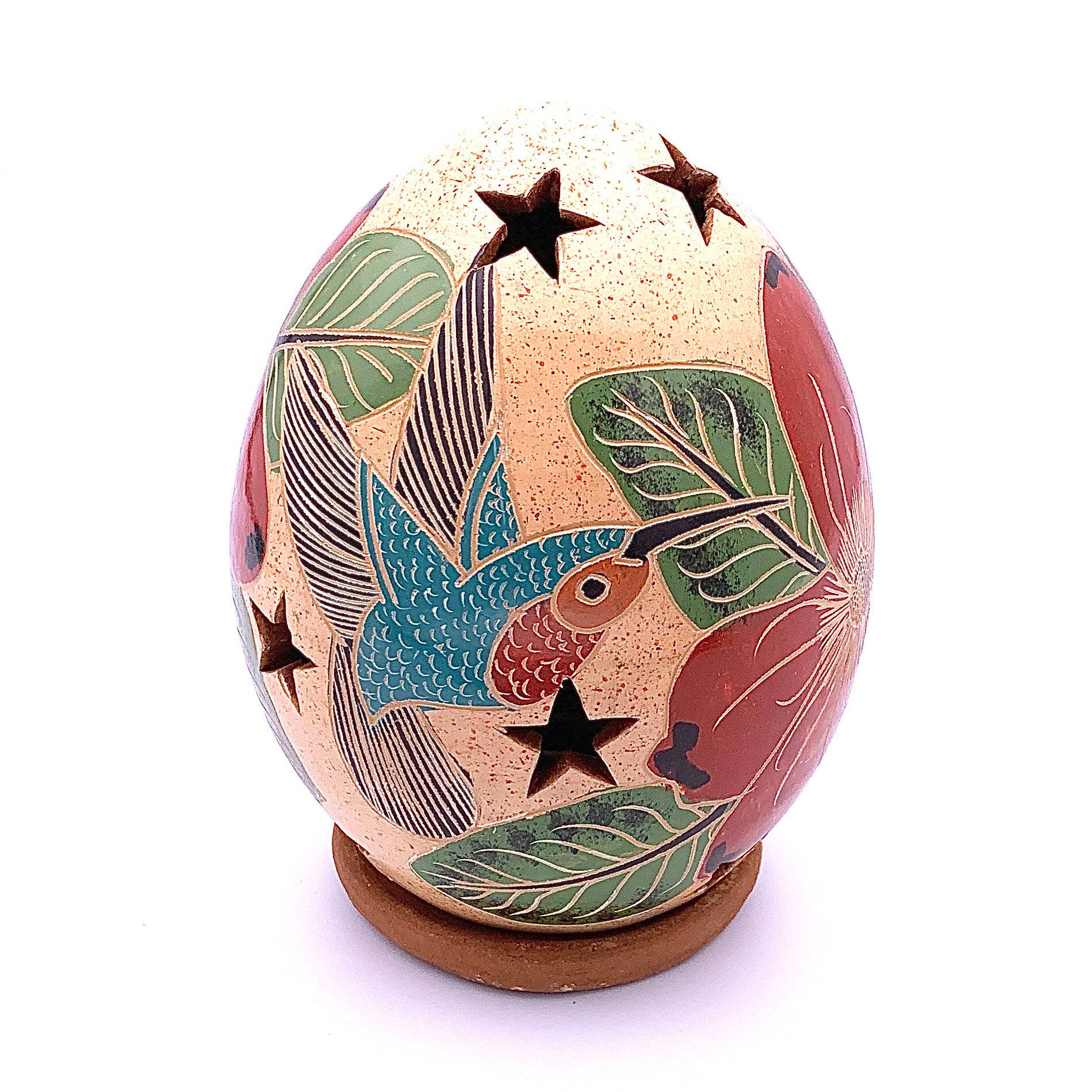 This beautiful botanical-themed ceramic luminary is handcrafted in a family workshop in the community of San Juan de Oriente, Nicaragua. Each luminary is created out of local clay, turned on a kick wheel, hand-painted, and wood-fired in a beehive-shaped kiln. For use with tea light candle or string of electric lights (not included). Approximate size: 4" wide x 5" high, Fair Trade.